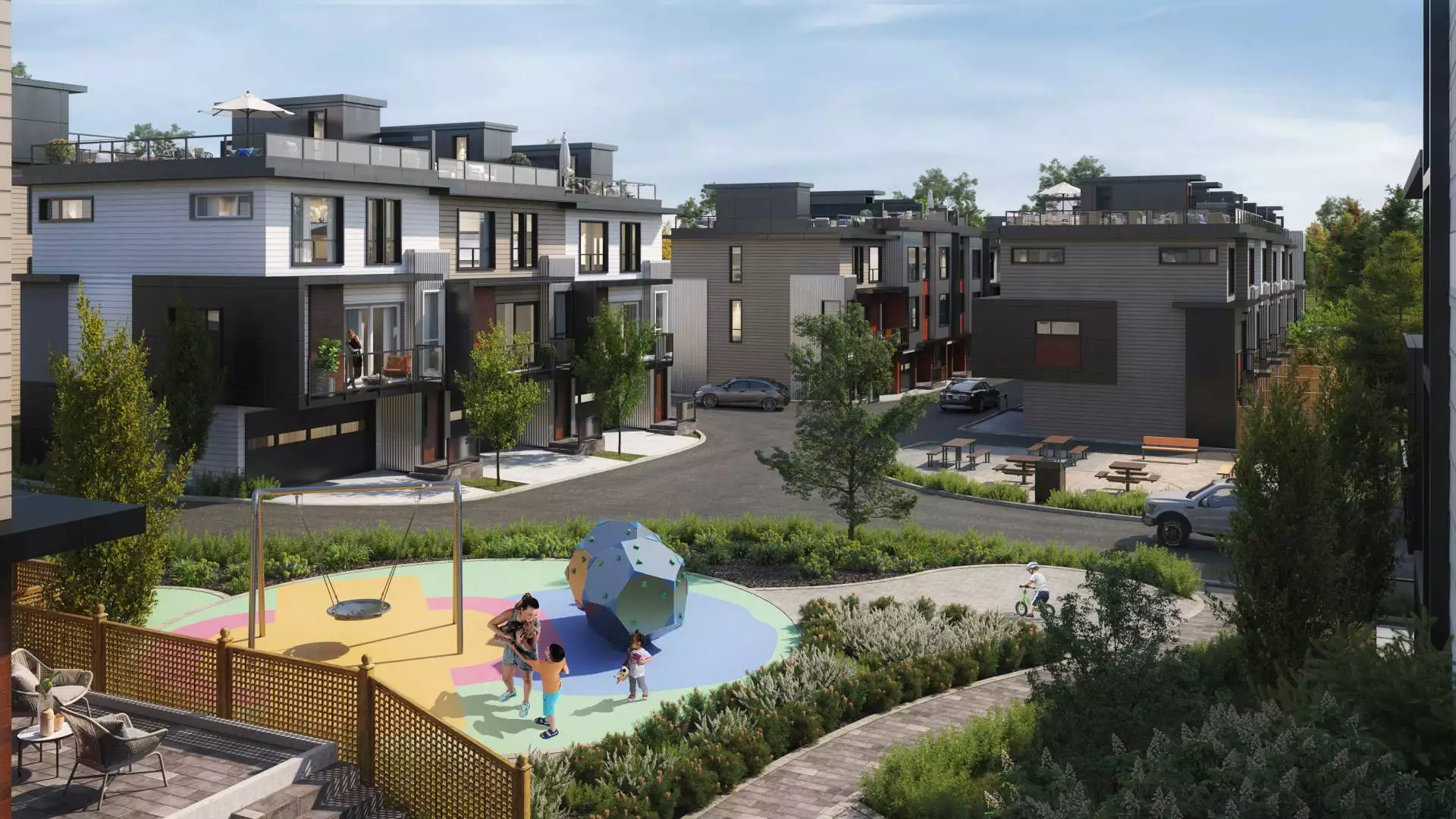 The community features 87 townhomes in Langley, each with three stories of thoughtfully designed space. Amenities within the complex include walking trails, a children’s play area, and a communal picnic space, enhancing the living experience and fostering a sense of community.